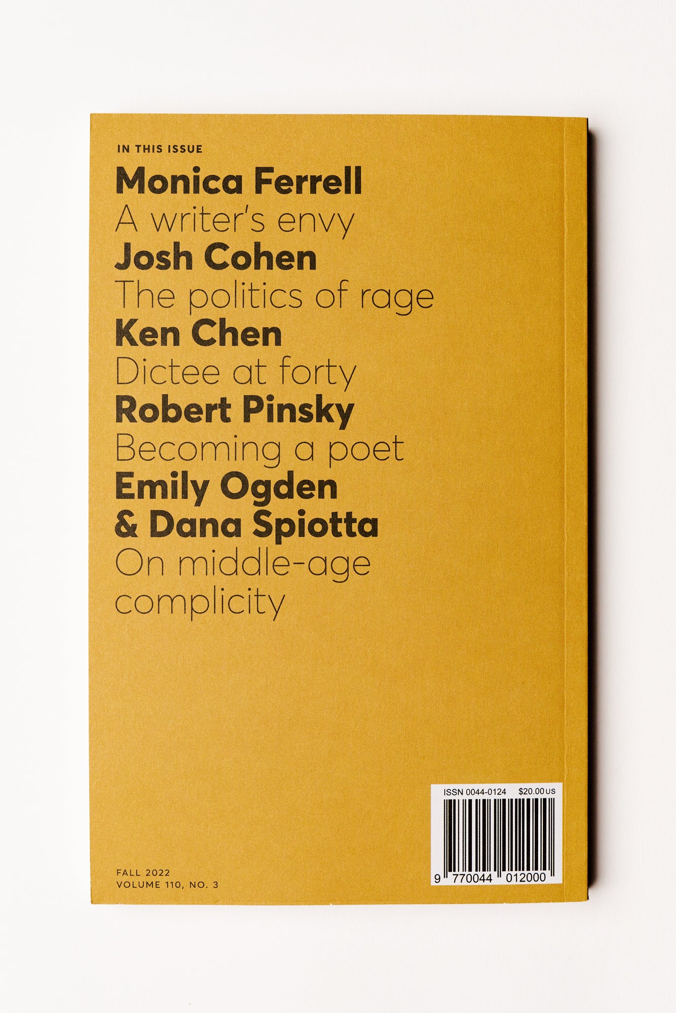 Our Fall 2022 issue features essays by Robert Pinsky, Marci Shore, and Alicia Puglionesi; fiction by Monica Ferrell and Kristen Arnett; poetry by Deborah Landau, Peter Gizzi, Cathy Linh Che, and Tomaž Šalamun; and a conversation between Dana Spiotta and Emily Ogden on complicity and middle age. Plus: a folio marking forty years since Theresa Hak Kyung Cha's Dictee, with reflections from Ken Chen, Latipa, Zahra Patterson, and others. Cover art by Elizabeth Hibbard.