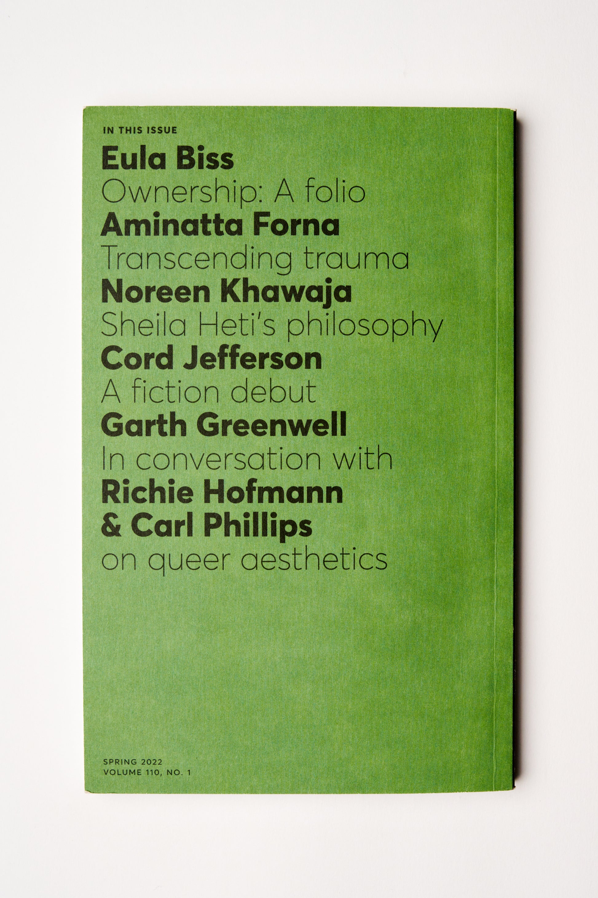 Our Spring 2022 issue gathers work around the theme of ownership—of land, language, memory, and the self. Edited by Eula Biss, the folio includes essays by Aminatta Forna, José Vadi, Aisha Sabatini Sloan, Glen Retief, and others, fiction by Nami Mun, and poems by Rae Armantrout, Cynthia Zarin, Tiphanie Yanique, and David Trinidad. The issue also features the debut short story by Cord Jefferson. In a conversation, Garth Greenwell, Richie Hofmann, and Carl Phillips consider the making of a queer canon, and Noreen Khawaja reflects on the “sublime modes” of Sheila Heti. Cover art by Kayla Gibbons.