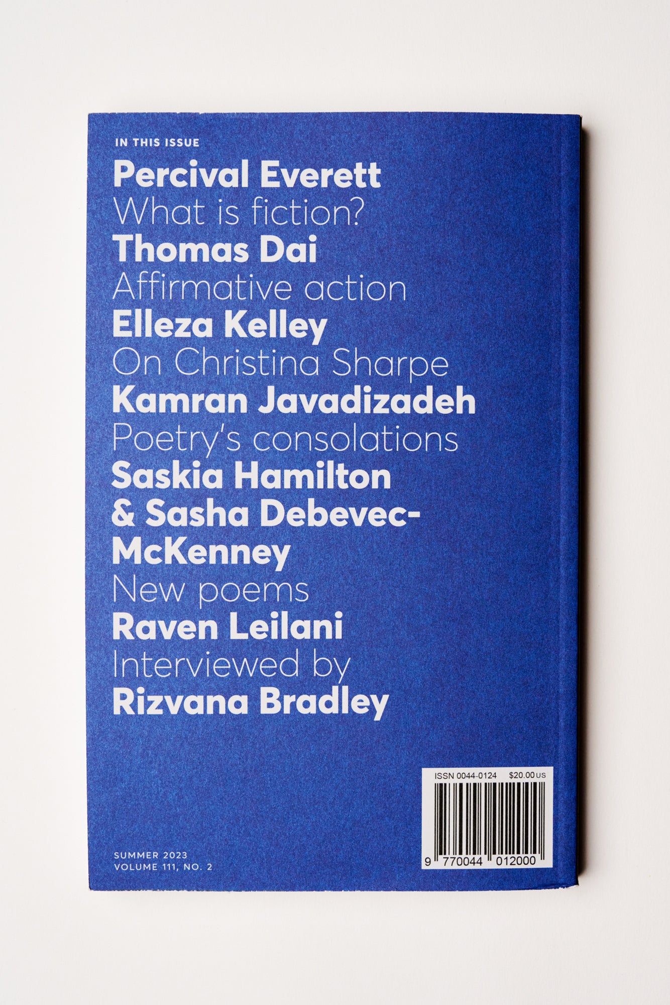 Our Summer 2023 issue features work by Emily Bernard, Donika Kelly, and Percival Everett. Plus: an interview with Raven Leilani and, in our criticism section, reviews by Elleza Kelley, Jennifer Ratner-Rosenhagen, and more. Cover art by Roman Cochet.